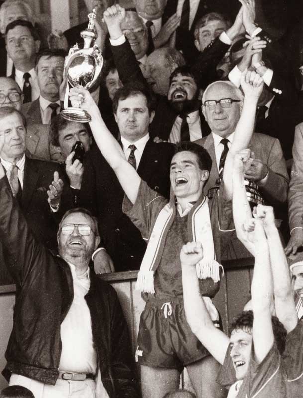 A never-to-be- forgotten day for Portadown football fans - Brian Strain holds aloft the Gibson Cup after the team beat Linfield to clinch the league trophy at Shamrock Park.