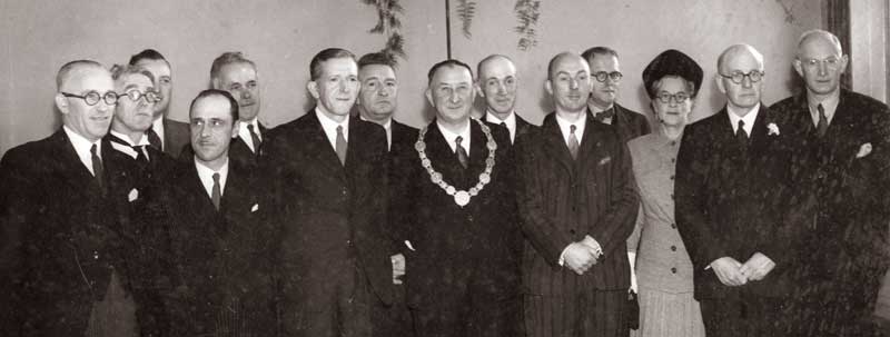 1947 Portadown Urban Council was Granted Borough Charter Left To Right;- Edward Cassels, Ralph O'Lone, ---3?---, Billy Wright, Andy Gamblin, Ned McCann, ---6?---, Bob Magowan, Tommy Hannah, George McGowan-Town Clerk, Twinem Jackson, ---12?---, ---13?---, ---14?---, Magowan Buildings in West Street were named after Mayor Bob Magowan. Billy Wright as an independent topped the votes in that year's polling. He was designated as an Alderman. There is a 1947 YouTube Video of the Borough Charter Ceremony at;- |