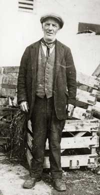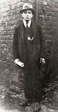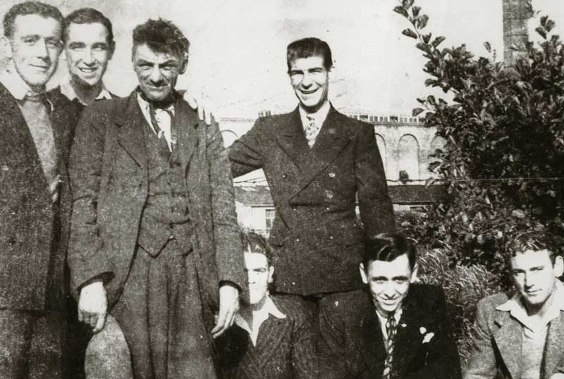 L to R; ---1?---, ---2?---, Herbie Briggs, ---4?---, Davy Rowland, ---6?---, ---7?---. By the River Bann, Hamilton Robbs factory in background. |