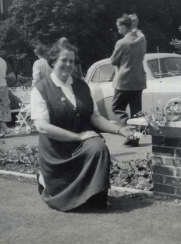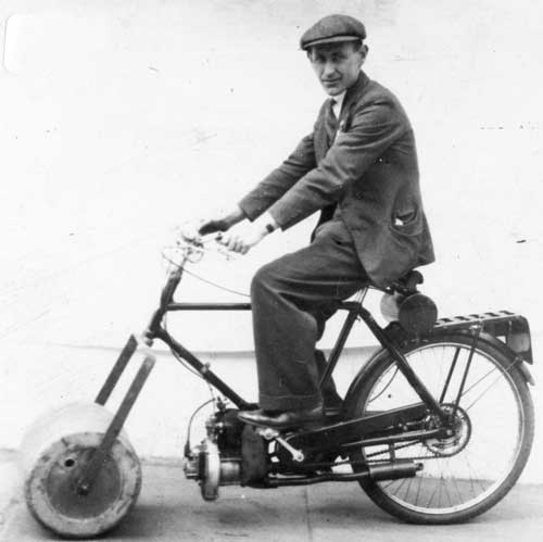 Jimmy Fletcher (owner of bicycle shop in Woodhouse Street in the 50's) Here he is seen sitting on a bicycle lawnmower that he constructed. |