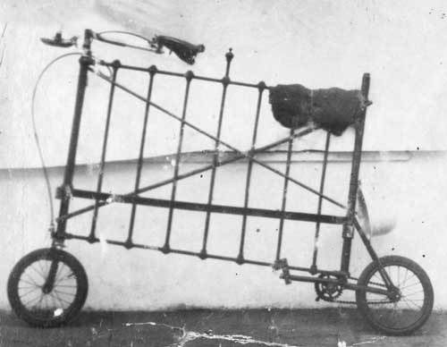 An old bed stead constructed to be used as a bicycle, an invention made by Jimmy Fletcher. |