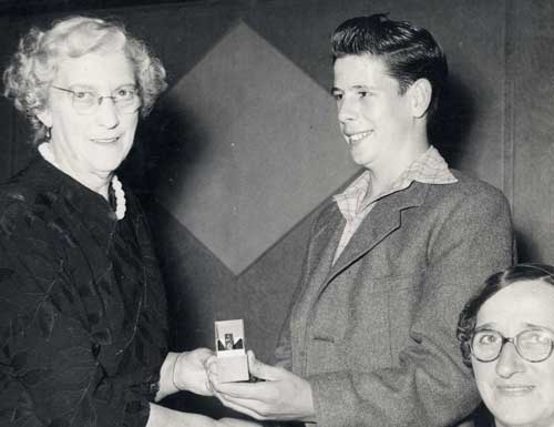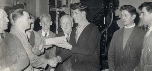 Presentation by Ben on behalf of the staff on retirement of 'Portadown News' owner Mrs Warnock. Lady on right is Mayoress Mrs Ralph O'Lone. |