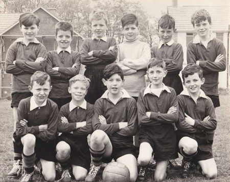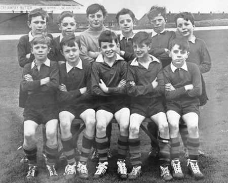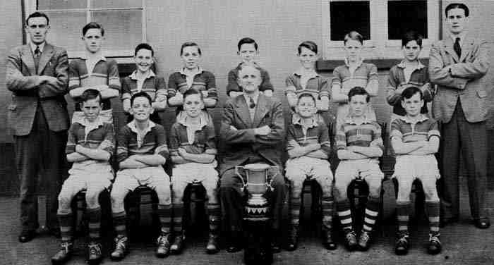 Back Row L to R: Mr E. Abraham, E. Stewart, W. Benson, L. Moles,(Capt.), J. Sullivan, J. Baird, B. Jones, J. Harrison, Mr. J. Barriskill. Front Row: K. Flannigan, G. Laverty, D. Baillie, Mr. Fairley, J. Young, F. Watson, W. Reid. |