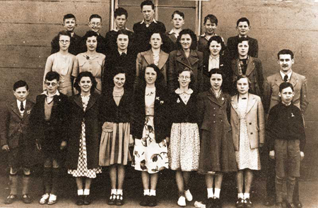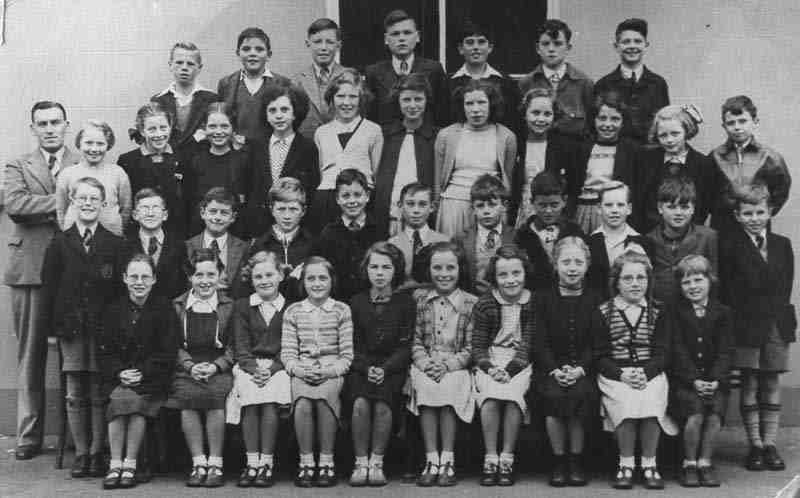 Back Row L to R: Ronnie Clements, David Richardson, Clifford Bell, Fred McCann, Jackie Magee, Maurice Crooks, Ronnie Blake. 3Rd. Row: (Teacher) W.T.R. Abraham, Louise Smart, Emily Frizell, Mildred McClelland, Mamie Blair, Betty Sandford, Barbara Crealey, June Morrison, Gladys Robinson, Myrtle Tate, Etta Henderson, Dennis Robinson. 2nd. Row: Victor Cassidy, Bryan Mortimer, Ronnie Perrott, David Boyle, David Hardy, Val Doak, Sam McCausland, David Armstrong, Gerald Robinson, Roy Harrison, Maurice Whitten. Front Row: Ruby Wright, Marion Magee, Sandra Black, Dorothy Chambers, Diane Wilson, Marlene Wright, Edna Greenaway, Ann Pettie, Betty Richardson, Margaret Young.