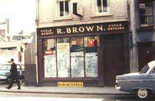 Woodhouse Street looking towards Obins Street. Bob Brown's cycle shop is first one on left of picture. This area is now part of Magown Buildings car park. The taller white building above the parked car was Eddie Castles general grocery store.
