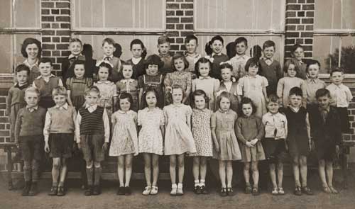 Back Row = Miss Campbell/Teacher-Jackie Coulter-Arthur Scarlet-Alec Carroll-William Donaldson-Wilfred Poots-Tom Forsyth-Jim Quinn-Walter Bailie-Charlie Stewart. Middle Row = John Kelly-George Barton-Elizabeth McCann-Jean Best-Helen McCullough-Barbara Whitten-Roslyn Cairns-Margaret Blair-Beryl Ruddell-Peggy Jameson-Margaret Adams-Jim Lyttle-Albert Proctor.