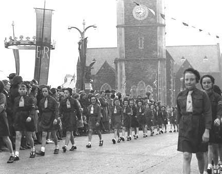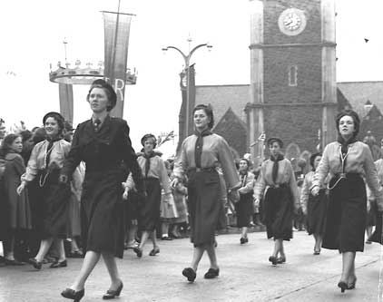 St. Mark's Girls Guides. Led by Rhoda Rowe, first row behind Rhoda, L to R: unknown, Iris Kells and Helen Day, visible at Iris's left arm is Doreen Hardy.