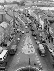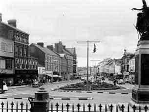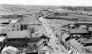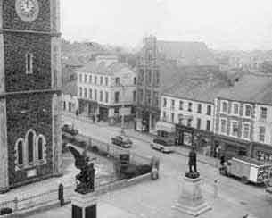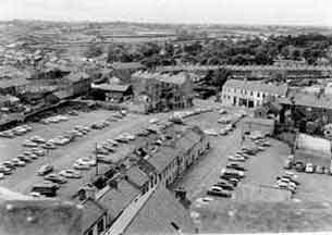 1956 Church Place, side of St. Mark's Church showing on right. The two Dr. McAnallen's lived and had their surgery in one of the big houses on the left. The detached square building top left was Church Street School, now belongs to St. Mark's Church and called Fergus Hall. Behind the Church in Church Lane is Gaynors Snack Bar, a popular meeting place for the youths of the sixties, it is still there. |