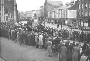 The funeral of some notable person passing through Market Street in the 1930's. Note the white bill-board on gable wall at right of photo, this was the entrance to Fowlers Entry, locally known as The Orange Cage. The tallest building, centre, was 'The Home Stores' |