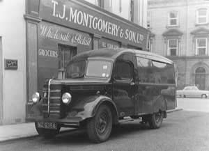 1950's Edward Street, Montgomery's delivery lorry outside their shop on the corner of Edward/High Street. The little plaque on wall at extreme left of photo says 'Joan Grey Photographic Studio' The building in background is 'The Bank of Ireland' in High Street. |