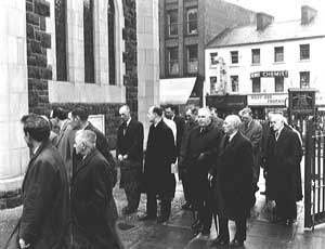 Late 1950's Local mourners entering St. Mark's Church for funeral service. Some names there, Bob Heathwood, builder, Bob Williamson, one time Mayor, Andy Camblin, councilor, Mr. McGowan, Town Clerk, Mr. Turner of Woodside Hill. Background shows, The Home Stores, Tower Ice Cream and West End Chemist.