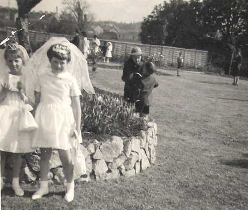 Photographs were taken about 1965/6 in the gardens of the Presentation Convent in Thomas Street, since then the building has been sold and converted into private apartments. The two little girls on left of photo are Catherine McGeough and Ann Donnelly on their 'First Communion Day' |