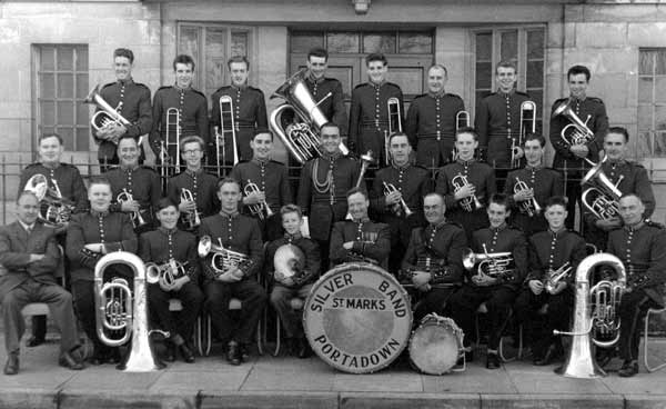 Photo loaned by Neville Hanlon. St. Mark's Church Band 1959 Left to right top row:- Billy Duke-Noel Rowland-Jim Lyttle-Sam Mullen-Trevor Cloughley-Joe Best- Robert Rowland-Gordon Ruddell. Middle row:- Freddie Woods-Alfie Watson-Howard Cassidy-Norman Rowland-Billy Speers-Eric Cassidy- Arthur Scarlet-Maurice Magee-Joe Neill. Front row:- Billy Dobbin (Conductor)-Harry Blair-Tony Benson-Harry Harrison-Des Cassidy-Billy Pepper-Johnny Rowe-Donald Rae-David England-Wilfie Doak.