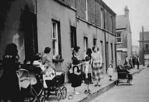 Irish Street, 'The Family Street' mid 1950's. Irish Street consisted of seven houses. In photo is Patricia and Kathleen McCann of No. 5 - Mary Campbell of No. 4. Most of the children belong to Mr. & Mrs. Patrick Gormon of No. 3. The boys at the bottom of the street are playing hand ball, they are Willie Black - Hugo Gorman and Jim Steele, the gable of the house belonged to John and Kate McConville No. 87 Obins Street.