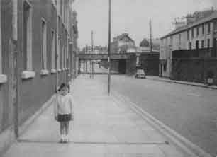 1968, little Bridie McVeigh stands all alone in Obins Street. Hagan's pub, 'Parkside Bar' is on right before bridge. turning right brought you into Curran Street. |
