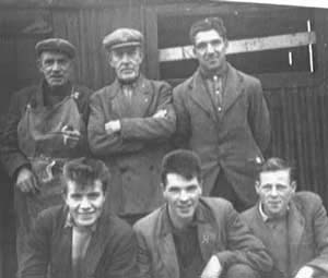 Six workers at Sam McGredy Royal Nursery packing department. Back row L to R: ? Toye of Maghery - John Conway of Derrytrasna - Harry Judge of Curran Street. Front row: Harry Creaney of Curran Street - Morris Hyde of Obins Street - Chris Harrison of John Street.