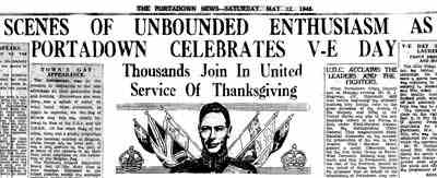 Portadown News Saturday May 12th. 1945 Portadown in common with every town and village throughout Northern Ireland joined to the fullest possible extent in the universal rejoicings of Tuesday, V-E Day, to mark the termination of warfare on the Continent of Europe. |