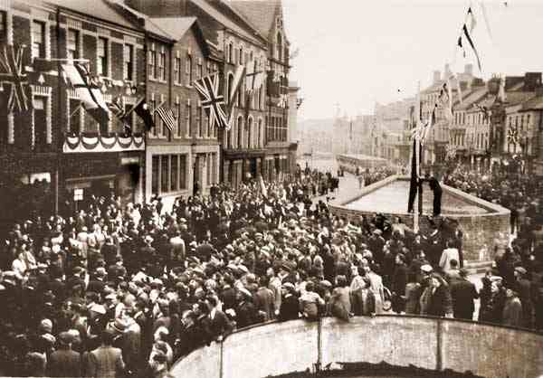On Monday the feeling of expectancy was at fever pitch and there were few who missed hearing the BBC news bulletins throughout the morning and early afternoon, hoping that Mr. Churchill would give the long awaited signal that V-E Day had come. When at last came the announcement that Mr. Churchill would speak at 3.00 p.m. on Tuesday, it is only true to say that to an extent there were signs of disappointment, but these did not take long to disappear. Soon the streets were filled with eager crowds, supplemented throughout the late evening by large reinforcements of all ages from the country districts, and it was soon evident that the restraint which had marked our expectancy would be broken. Towards nightfall the crowds were in fine form and dancing and games were the order of the night. Young people and the children too left the congested pavements and joined the amusements on the main thoroughfare from St. Mark’s Parish Church down to Bridge Street. Not least happy were the Belgian soldiers who had come into town to give vent to their joy at the defeat of the German nation and the liberation of their homeland. With the best good humour and the assistance of admires they united with the swirling masses of jubilant people and they had a merry time. Some of them had secured Belgium flags and with these they lead processions here and there, up and down.