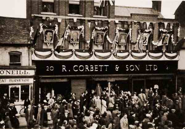 View from St. Mark's Church. Foreground shows part of empty circular water tank, further on another triangular tank filled, the purpose being to insure a readily supply of water in the event of incendries dropped by enemy aircraft. Beyond is air-raid shelter in High Street. | Market Street, Corbett's decorated with portraits of Stalin, Churchill, King George VI, Queen Elizabeth , Roosevelt and DeGaulle | |||||