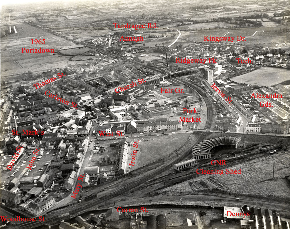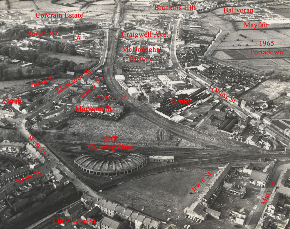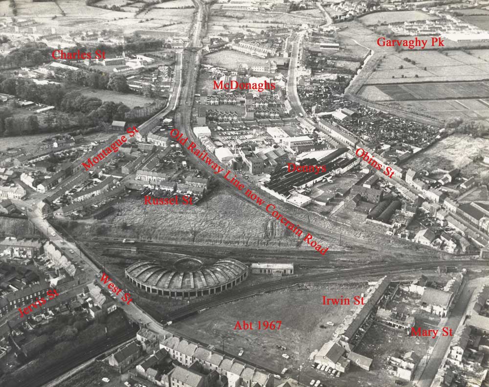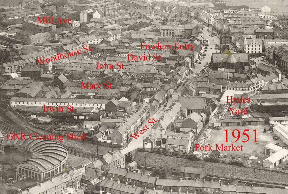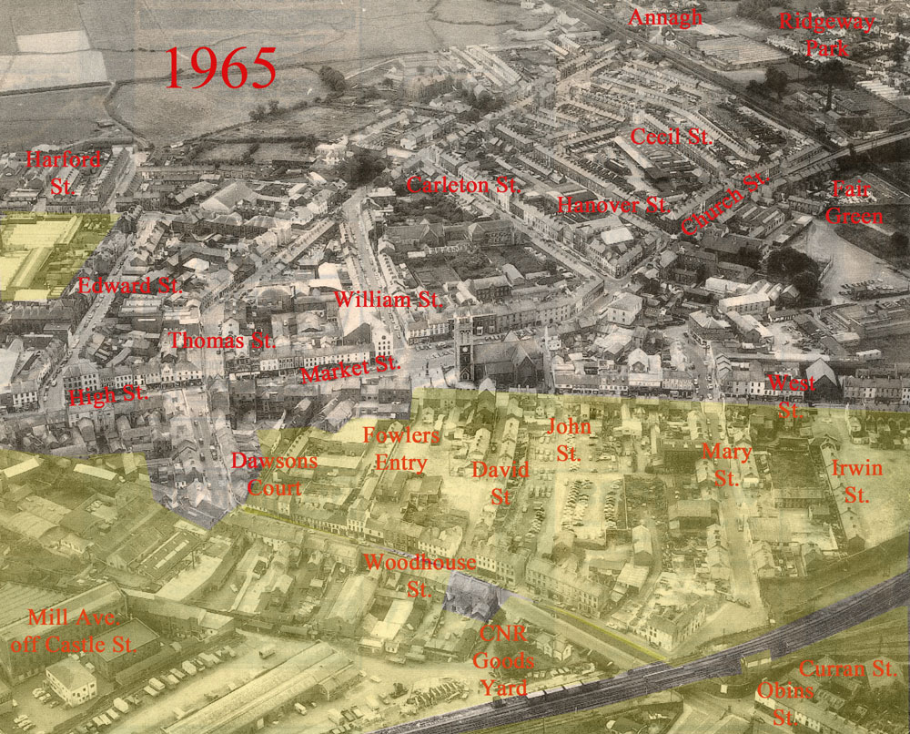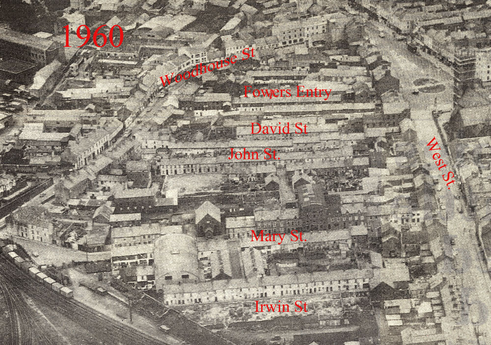 ![]() 9 List of streets completely demolished in the mid to late 1960's Curran St,, Irwin St., Mary St., Morrisons Court (off Mary St.) John St., David St., Fowlers Entry, Dawsons Court (off Woodhouse St.) Old Junction Row, Irish St., River Lane, Frances St., Marley St., Union St., Henry St., Margaret St., Russell St., Sarah St., Dawsons Row in Charles St. Bright St., Meadow Lane. Foundry St. Florence Court, Castle Ave. Sections of these streets; West St., Charles St., Montague St., Bridge St., Ormonde St., Obins St., Carrickblacker Rd., Sandy Row. Below; Tinted area completely demolished and re-developed.