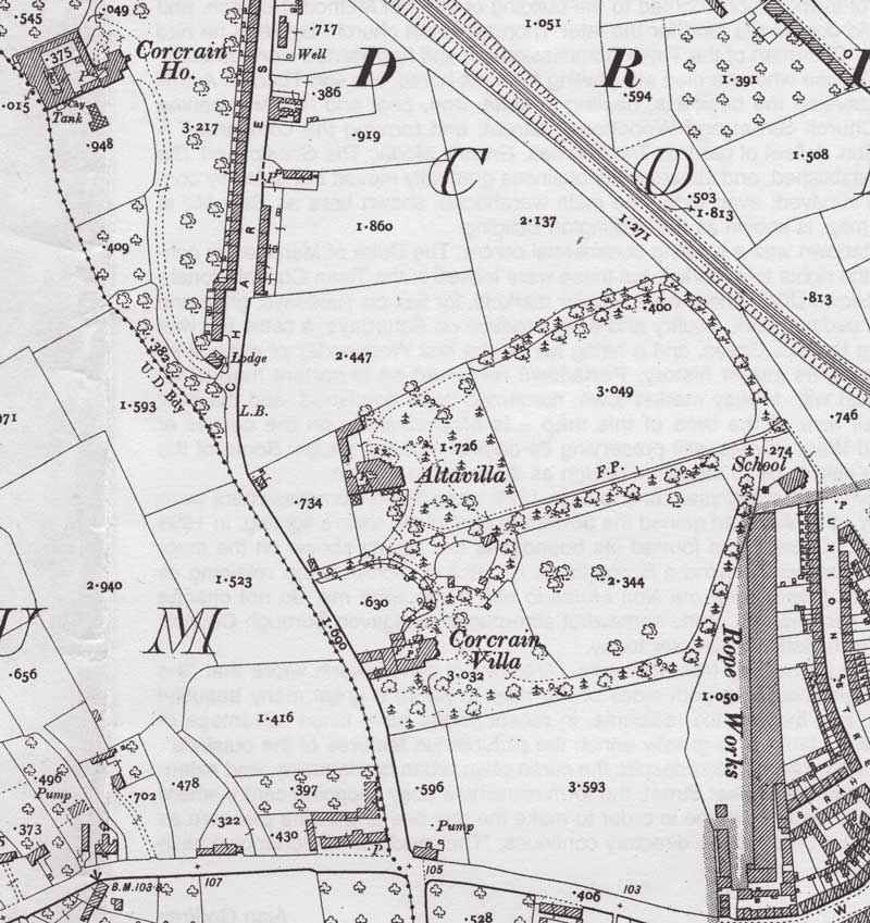 1906 - Corcrain area continues beyond top of map, bottom right is part of Edgarstown area, and bottom left the Loughgall Road area. Corcrain House once the home of the Dawsons/Atkinsons is now the site of 'The Oaks' sheltered housing and Corcrain Housing Estate. Altavilla once the home of Averill Shilington now St. Francis Nursing Home. Corcrain Villa once the home of Charles F. Wakefield, most likely where the street name originated, the building was demolished, replaced by new building, home of James Finlay, owner of Savoy Restaurant in West Street, his home became Parochial House of RC Church, that building was demolished about 2002 site being used for development of present private Housing Estate. The plot below Corcrain Villa which bounds Charles Street and West Street is now Greenview Gardens. Site opposite Altavilla is where Hart Memorial Primary School stands.. The rope works in Edgarstown area was owned by the Logans.