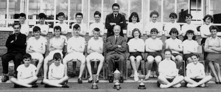 Athletic Team Inter-School's Sports Day 1958 Back Row L to R. David Jackson, Kenneth Craig, Dennis Hollywood, Maurice Stewart, Darryl Smith, Mr. Jim Foote, Dawn Fiddes, Betty Jones, Eleanor Kane, Elizabeth Brown Jean McClelland, Middle Row: Mr. Kenneth McClelland, Mervyn Taylor, Earl McCrory (Capt.), Bertie Mullen, Harold McCoo, Mr. David Watson (Headmaster), Elspeth Crieth, Lorraine Rowan, Lorraine Lockhart, Alisha Purvis, Miss Ruth Kernaghan. Sitting: John Richardson, Merlin McMahon, Margaret Gilpin, Gertrude Whitten. |