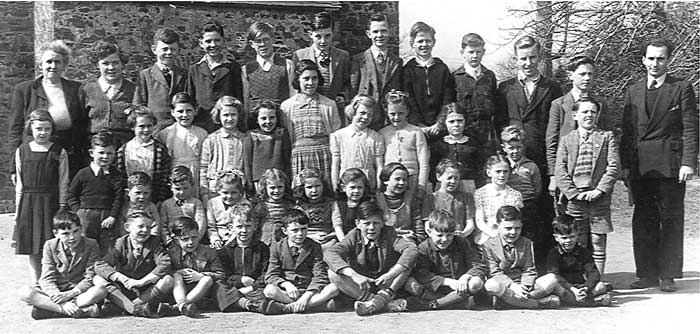 Back Row: Mrs Henderson, Florence Sinton, Bert Stanley, Joe Lavery, Bertie Sinton, Kenneth Hutchinson, Bert Greer, Alan Gillespie, Leslie Wortley, Malcolm Haire, Bobby McKee, Mr Grundle. 3rd. Row Standing: Anna Clayton, Wilfred Henderson, Jean Millar, Unknown, Bertha McKee, Doreen Pearson, Eva Clayton, Elizabeth Sinton, Ruby Taylor, Brenda Elliott, Derek Wortley, Tommy Johnston. 2nd. Row Seated: Ronald Henderson, David Henderson, Stella Taylor, Joan Elliot, Elizabeth Matthews, Jennifer Quinn, Roberta McClelland, Ruby Elliot. Front Row on Ground: Kenny Haire, Kenny Wortley, Unknown, John Greer, Harry Elliott, Wesley Cairns, Ronnie Taylor, Alan Hutchinson, Stephen Millar.