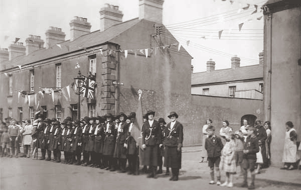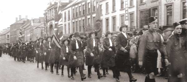Market Street Empire Day Youth Parade about 1930. Miss. Doreen Espie leading Armagh Road Girl Guides. The building extreme right of photo was the Globe Bar, next to that was a tobacconist & newsagent shop, it was owned by the Jeffers family 1950-70's. next to that was Sherman's Chemist, the family lived above the shop, next was Edgar's hardware shop. |
