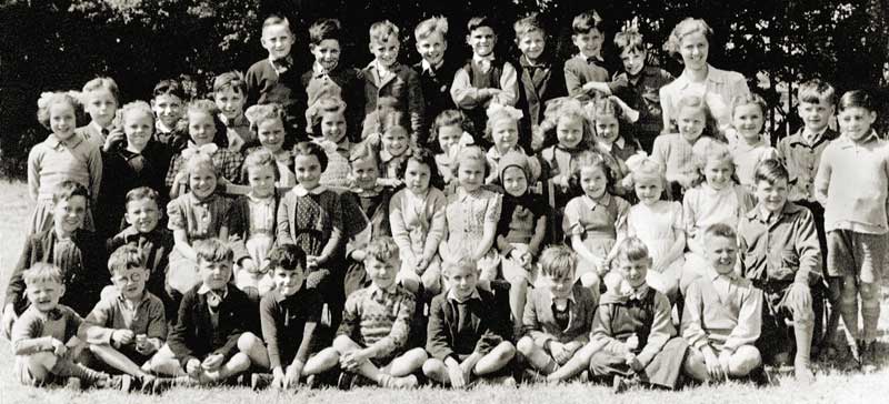 Dated Positive 1947 Back Row L to R: Joe Saunderson, Frank Hayes, Neville Fleming, Alex Connolly, Bobby Forde, David Rowan, Colin Blair, --- Campbell, Miss Campbell. Third Row Standing: Elizabeth Millar, Dennis Andrews, Jean Gregson, Charlie Lappin, Sylvia Porter, Kenneth Forde, Edith Proctor, May Cooke, Joan Lyttle, Margaret Linton, Norma McNeill, Ann McMurray, Arlene Watson, Anne Neill, Ann Beattie, Ivan Johnston, Frankie McCreery. Second Row Two Kneeling Others seated: Loudan Quinn, Reggie Best, Eileen Woods, Fiona Smyth, Norma Bailie, Audrey England, Joan Copeland, Myrtle Willis, Emily Fleming, Kathleen Scarlet, Gladys Smyth, Florence Smyth, David Cloughley. Front Row on Grass: John Morton, Robin Morton, Jim Allen, Rodney Vennard, Sam McCreery, George Crowe, ---7---, Reggie Matchett, Tommy Johnston.
