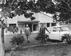Showing frontage of main office at Woodside. On left is 'Uncle Walter'. Sam's father died when Sam was a child, his uncle Walter Johnston managed the McGredy empire until Sam came of age. To right of Uncle Walter is George Priestly, office manager, now residing in Australia. |