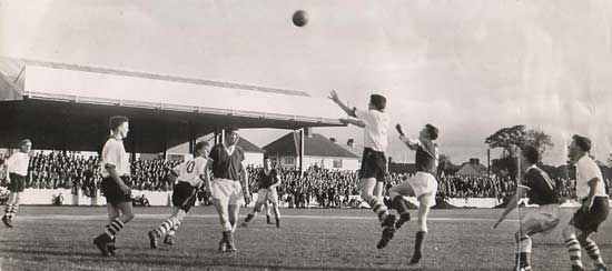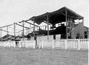 The grandstand after fire in 19??. Loaned by Marian Chambers At Portadown's grounds, Sammie Chambers is 2nd. from left of photo.