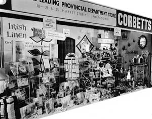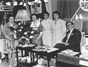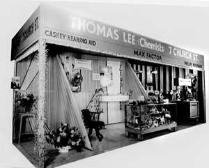 On the display stand of Tommy Rainey electrical goods retailer, Tommy is seated at right of picture. |