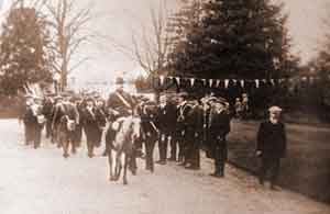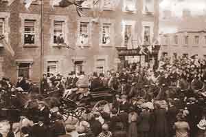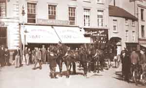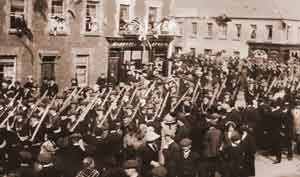The two photos below show the Ulster Volunteer Force parading past Mr. Moffat's Photographic Studio in Bridge Street. The Ulster Volunteer Force joined the British Army en-block, shortly after this photo was taken most of them lost their lives at the battle of the Somme in France. |