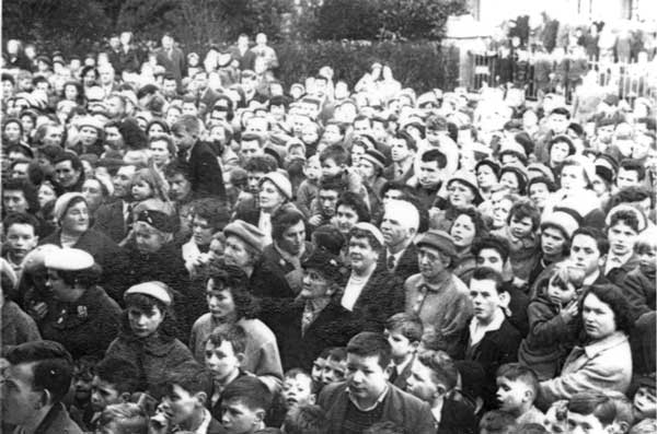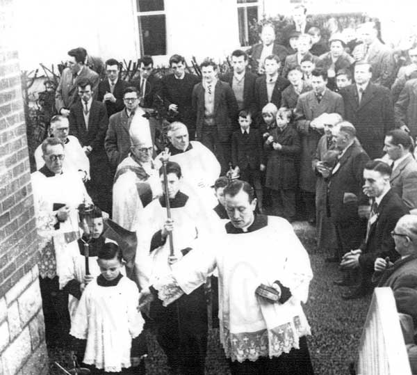 Opening Day of St. Mary's St. Mary's Hall was built in 1958. It was blessed and opened by Cardinal Dalton in December. Until that time most of the social events in the parish were held in the vacant boys school in Curran Street, and there was much fund raising when a new hall became a possibility. Procession Blessing with Cardinal Dalton are Father Early, Canon Rice and others. Some in the crowd are: Seamus McCaffrey-Jim McNally-Frank Kelly-Brian Judge-Seamus Maginnis-Joe McGurguian and John Greenwood.