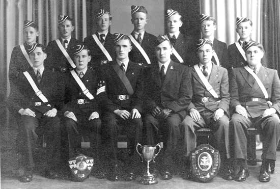 About 1950's ? Lurgan & Portadown Drill Squad Competition. - Belfast Btn. Trophy & The N.I. Drill Squad Competition. Back Row L to R; Edwin Joyce - William Hewitt - Maurice Davison - Billy Lambe - Harry Burrows - Noel Magee - Roy Woolsey. Front Row: Kenny McClatchey - Jim McClung - Sgt. Harry cooke - Capt. William Coulter - Dessie Graham - Wilson Joyce. |