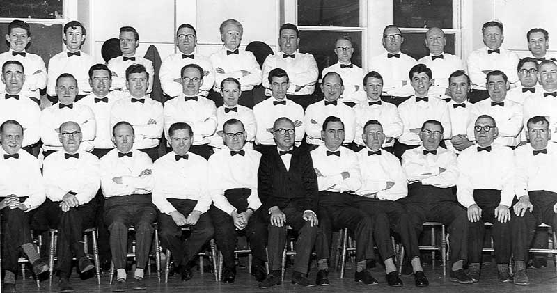 Back Row L to R: William Johnston - John Wright - Matt Lamb - W. Watson - E. Best - Dennis Redpath - M. Campbell - R. Wright - E. Walker - William McNally - Mervyn White. Middle Row: Ernie Montogomery - Jim Hewitt - Cyril Stevens - ??? - Ivan Davison - j. Cassidy - Tommy Stewart - H. Gates - Graham Lyttle - A. Robinson - Wesley Johnston - W. Gibson - R. Millar - S. Withers. Front Row: Noel Carville - Ernie Lyttle - Leslie Briggs - Sammy Hall - George Russell - Norman Lyttle (Conductor) - B. Gibson - D. Wright - F. Pillar - C. Lyttle - John Baxter. Photo loaned by Phyllis Flannagan