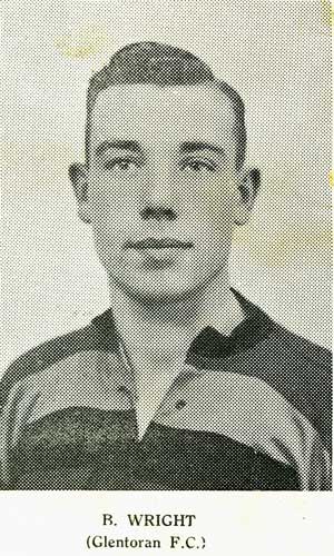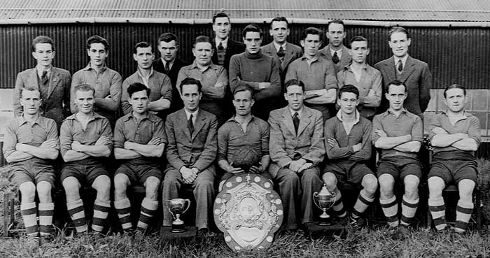 Back Row L to R:- Harold Elliott, Frank Dynes, Malcom Wright, T. Heaney. Third Row: Alfie Curran, J. Ewart, J. Elliott, Jackie McMahon, Joe Madill, Ronnie Baxter. 2nd. Row: J. Carson, B. Montgomery, N. Best, Jimmy Croft (Capt). Eric Bailey, Robert Cartmill. Front seated: Tommy Moore, Sidney Donaldson. |