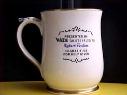 Photos to right were emailed by Maurice Fenton, son of Bob Fenton both now living in New Zealand. Bob worked at Wades as a maintenance fitter/toolmaker at the time of the Watson Street factory fire on 29th. October 1956. This commemorative mug was commissioned and presented to employees in recognition of their efforts during and after the fire, on reverse the mugs were inscribed with individual employees name making each a unique Wade piece.